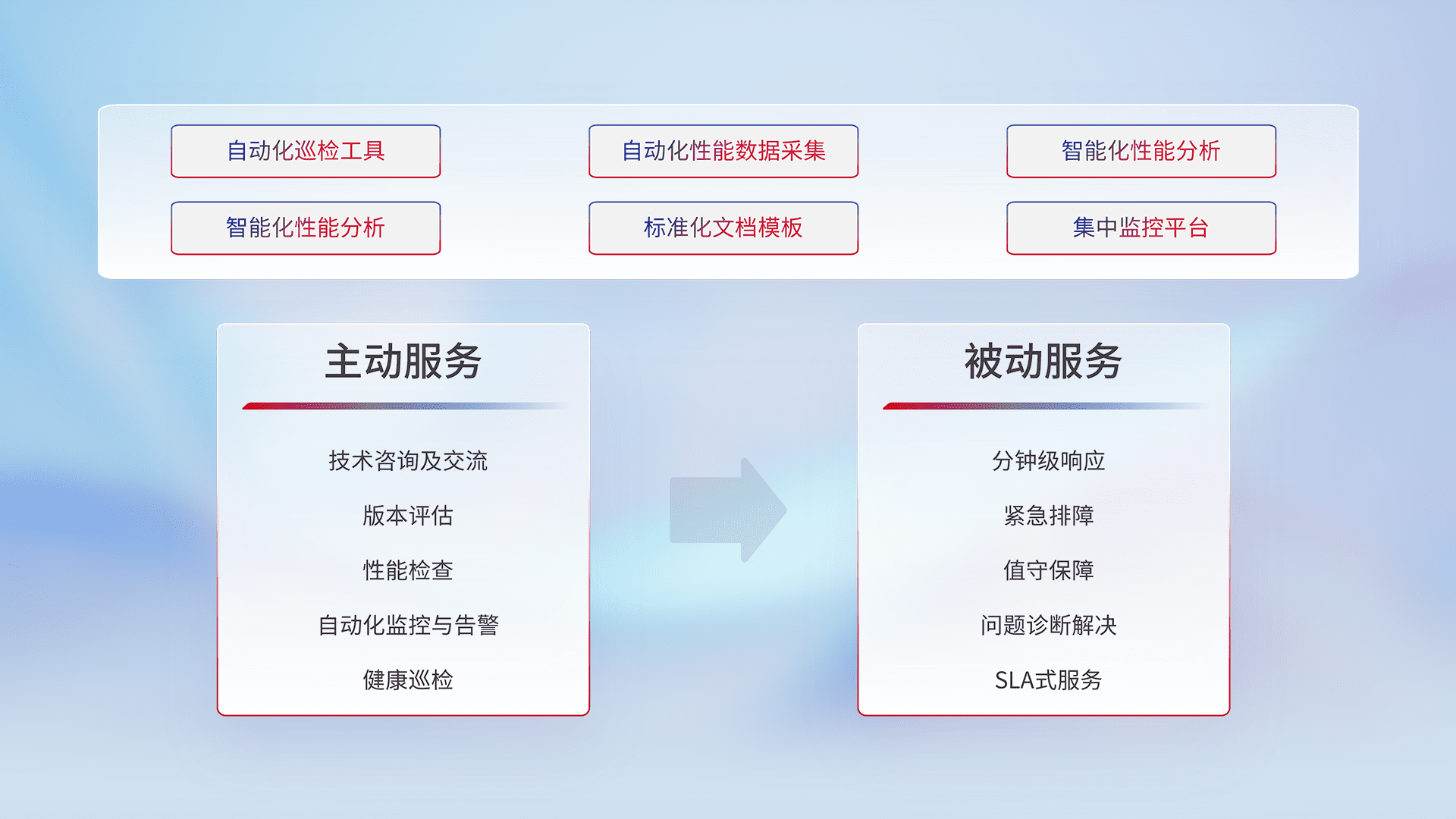 智能化工具和标准化文档,,,,保障服务质量,,,提供主动服务(包含技术咨询、、、版本评估、、、性能检查、、、、自动化监控与告警、、、、健康巡检)和被动服务包含(分钟级响应、、紧急排障、、、值守保障、、、问题诊断解决、、、SLA服务)。。。