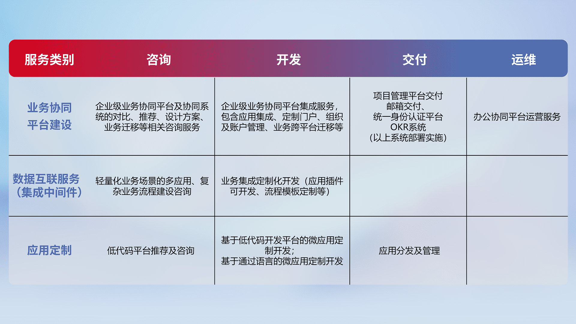 针对钉钉、、、、企微、、IDaas等平台级产品提供产品的规划、、、、方案、、交付、、、、定制化开发等服务,,实现如统一协同办公、、智能客户服务、、混合会议管理、、智能数据查询、、等业务场景,,,,实现数字化转型。。
